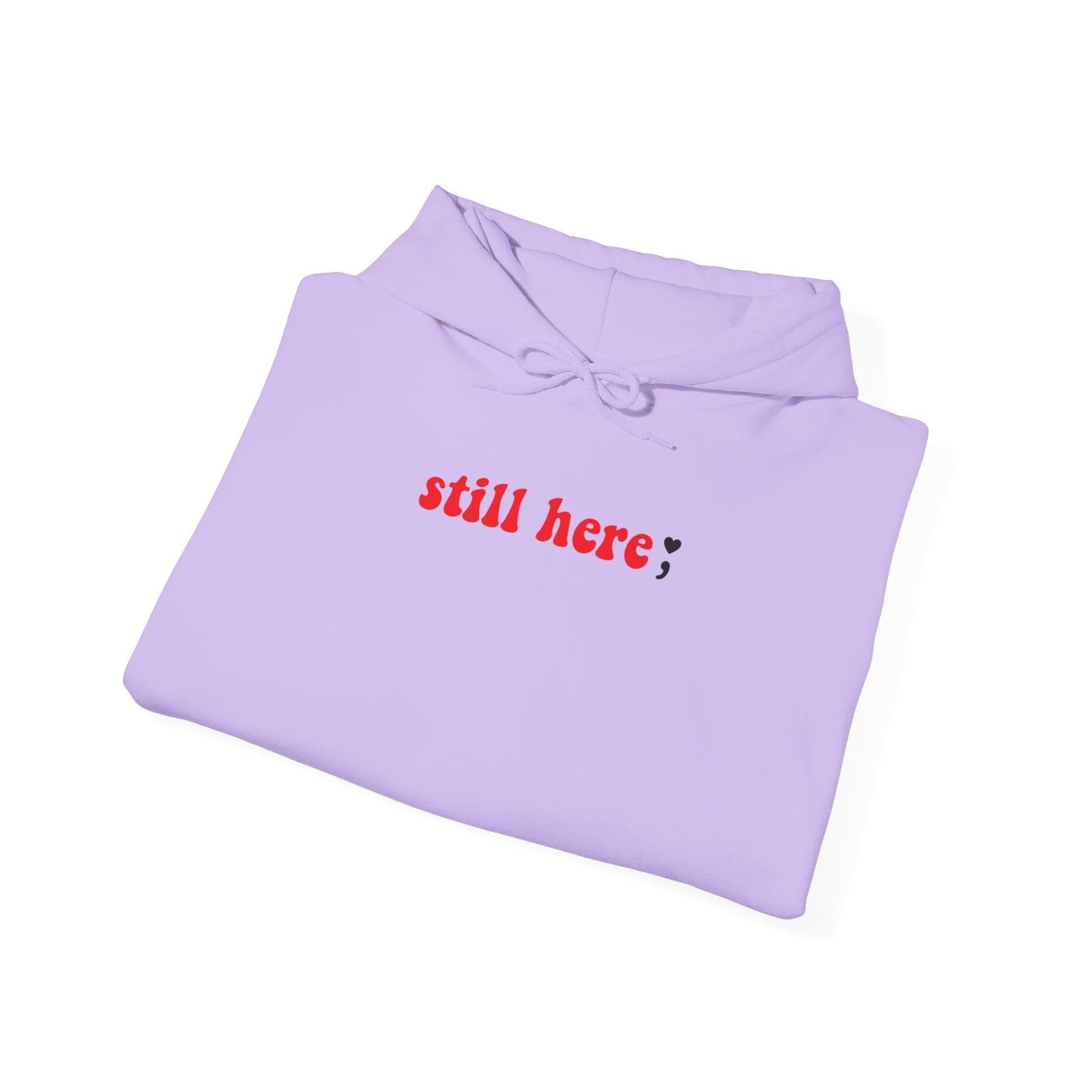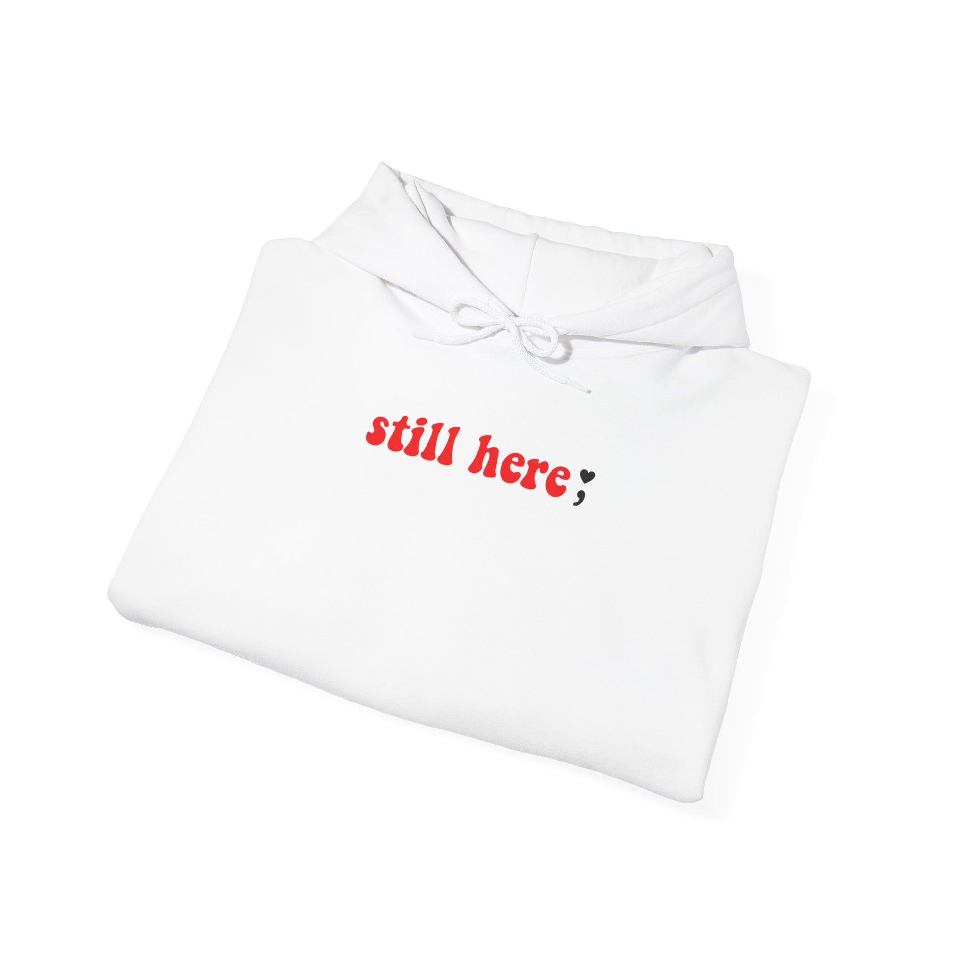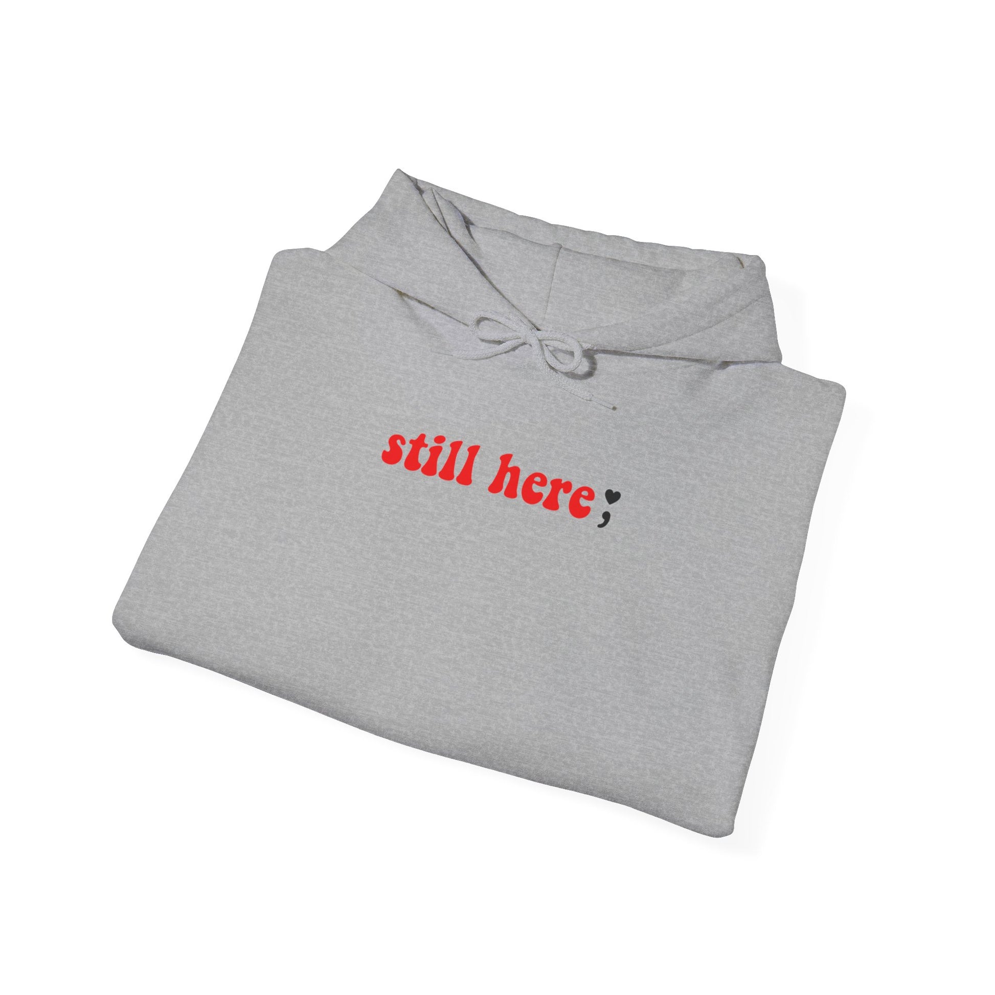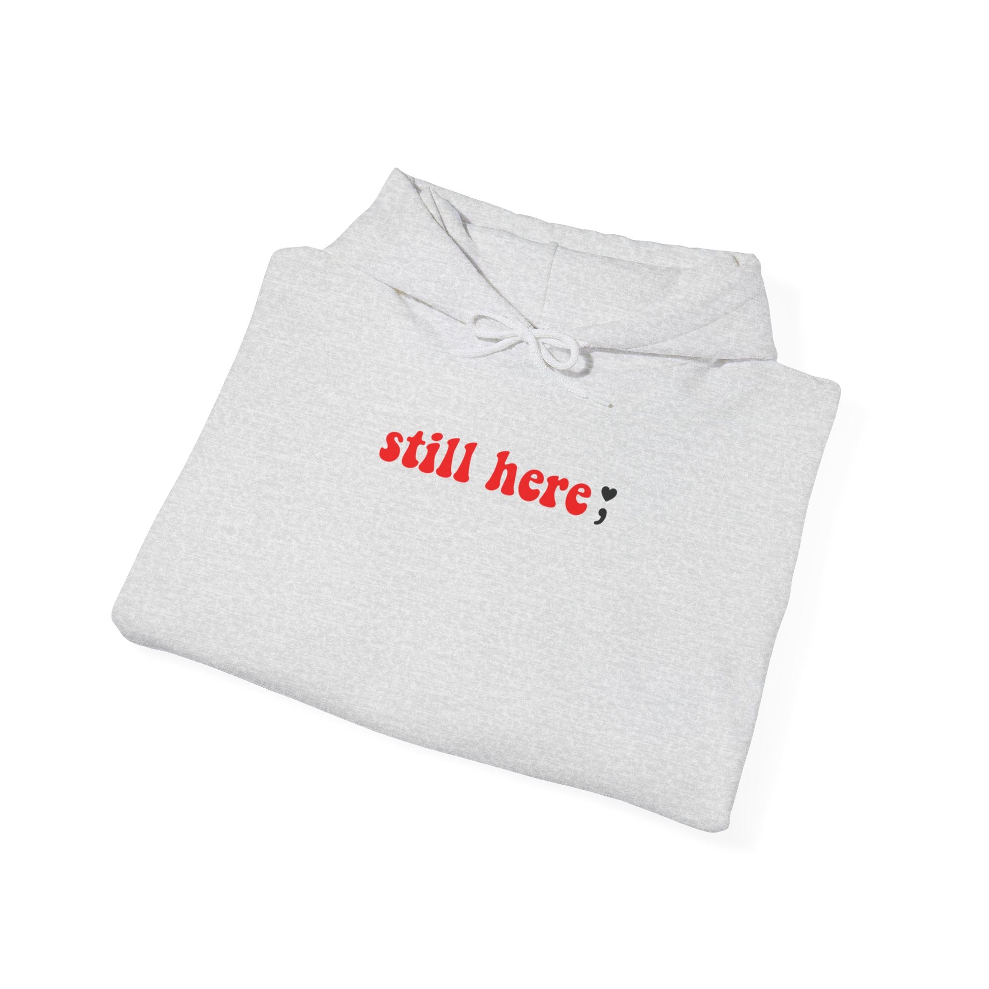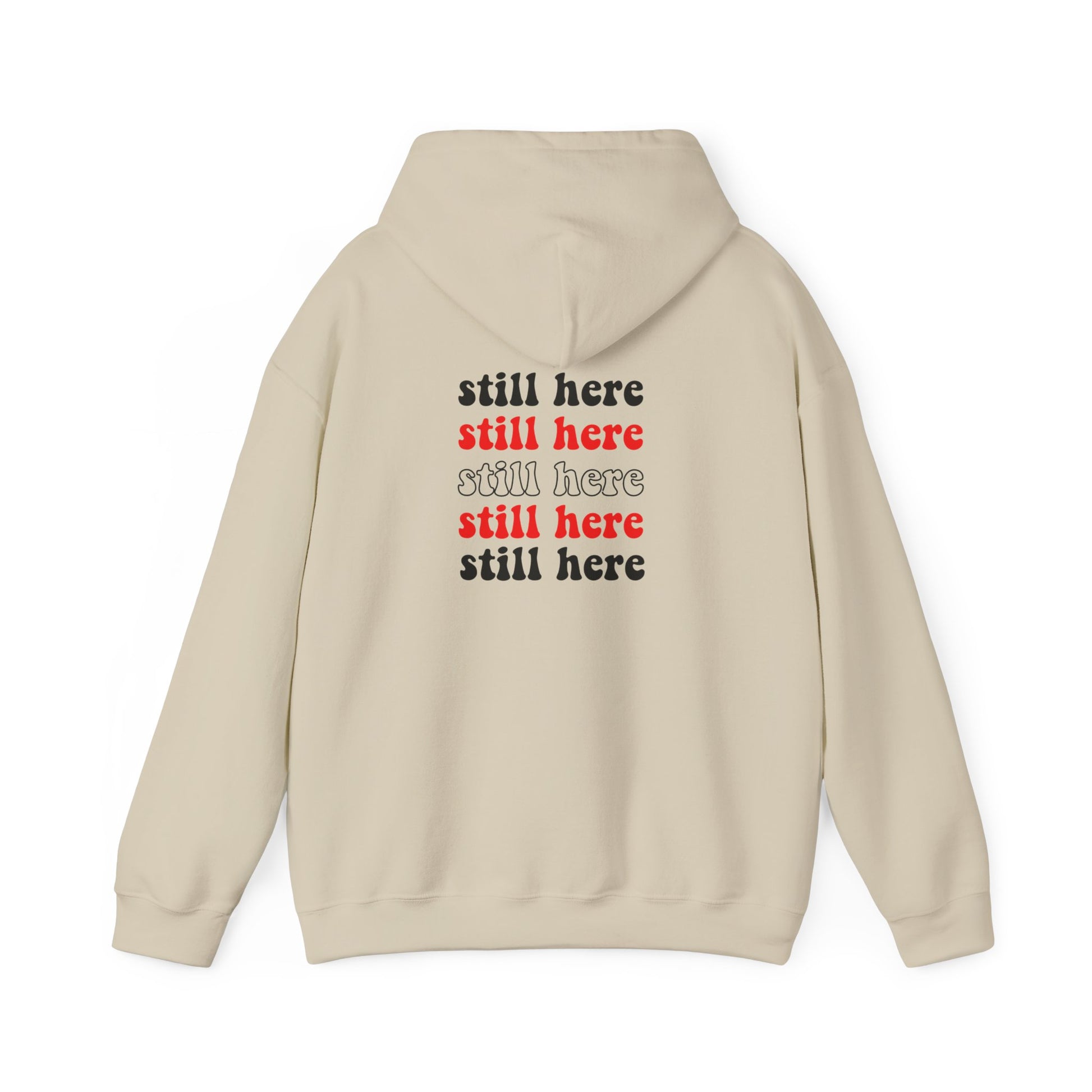 Introducing the perfect companion for those chilly days: our premium Unisex Hooded Sweatshirt. Crafted from a soft blend of cotton and polyester, this sweatshirt delivers ultimate comfort while keeping you warm. The stylish design features the phrase 'still here' prominently displayed on both the front and back, creating a statement piece that resonates with resilience and presence.